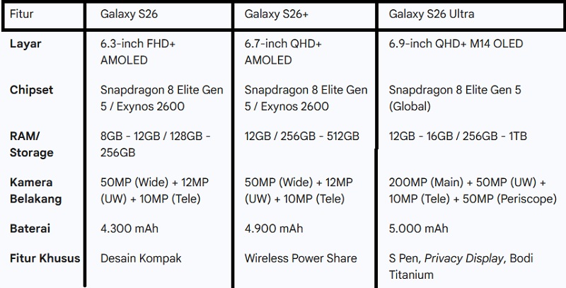 Samsung tampaknya masih sangat percaya diri dengan formula tiga varian untuk memenuhi kebutuhan segmen pasar yang berbeda. Berdasarkan data yang dihimpun hingga awal tahun 2026, raksasa teknologi ini tetap mempertahankan trio andalannya: Samsung Galaxy S26, Galaxy S26+, dan sang kasta tertinggi, Galaxy S26 Ultra.