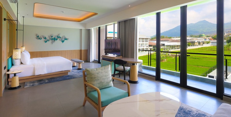 - Karakteristik: Hotel dengan desain modern yang dipadukan dengan pemandangan sawah dan pegunungan yang asri.