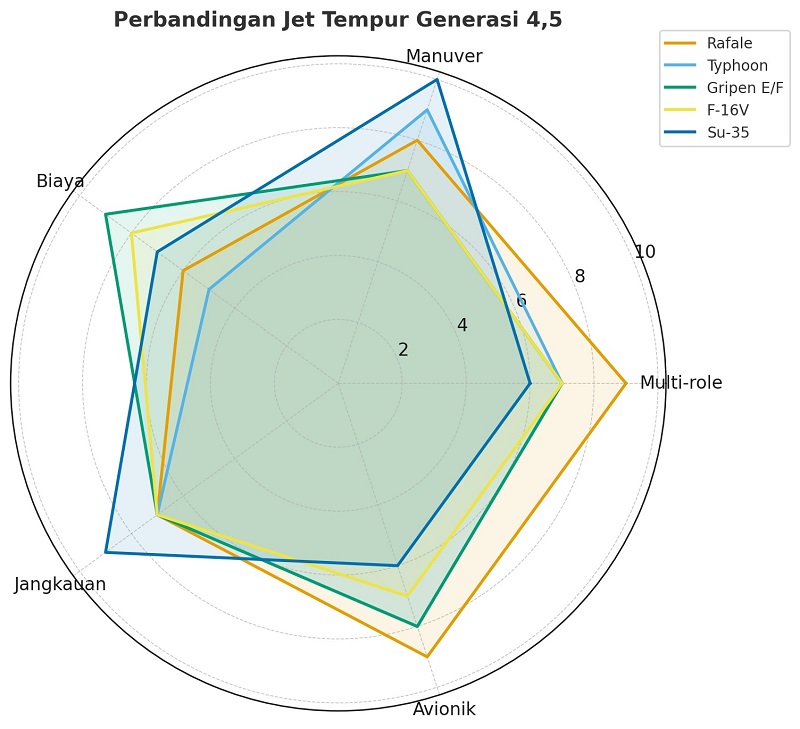 Rafale, Thypoon, Gripen E/F, F-16V dan SU-35 adalah generasi pilihan kelompok jet tempur alternatif atas mahalnya generasi 5. Sementara Generasi 4 sudah terlalu usang. Berikut perbandingannya.