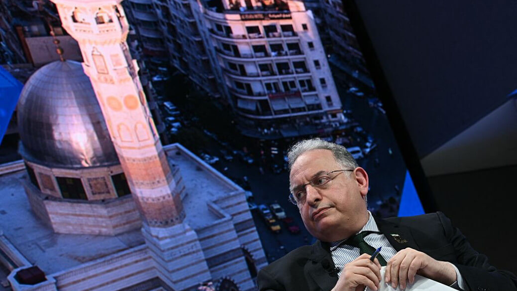 Menteri Keuangan Suriah Mohammed Yisr Barnieh, berbicara di Dana Moneter Internasional (IMF) di Washington, menjadi delegasi pertama Suriah ke IMF dan pertemuan semi-tahunan para gubernur bank sentral serta menteri keuangan Bank Dunia sejak perang saudara pecah di negara itu tahun 2011.