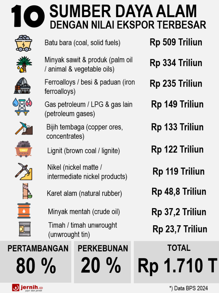 Dari 10 komoditi ekspor berasal dari sumber daya alam (SDA) delapan di antaranya dipasok dari sektor pertambangan. Yang dua di antaranya berasal dari minyak dan gas. Sementara dari sektor perkebunan hanya ada dua. Berapa total nilai ekspor Indonesia yang tercatat sampai akhir 2024?