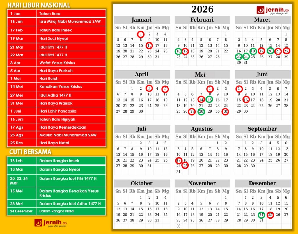 Pemerintah menetapkan 17 hari libur nasional sepanjang 2026. Beberapa di antaranya termasuk harpitnas alias Hari Kecepit Nasional. Karenanya ditentukan pula sebanyak 8 hari cuti bersama. Siap-siap saja bulan Maret dan Mei yang bakal banyak hari bebas nasional alias libur panjang.