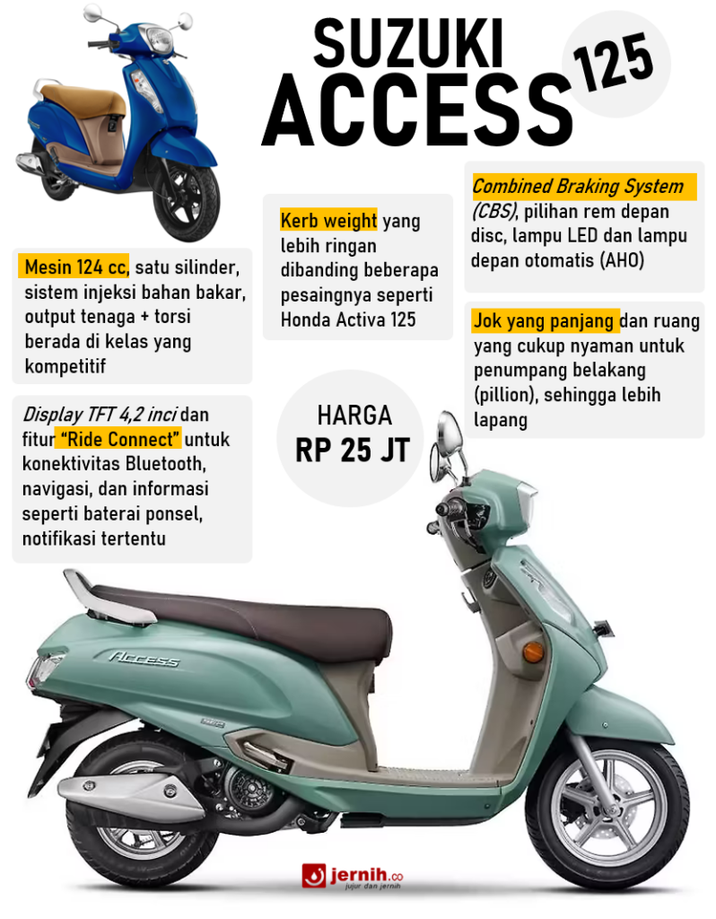 Suzuki menantang Honda dan nama-nama lain lewat Suzuki Access 125. Bodinya cukup menawan, desainnya tidak murahan. Kombinasi desain stylish, efisiensi luar biasa, dan fitur pintar siap memanjakan perjalanan harian Anda. Apa saja lima keunggulan yang ditawarkan?
