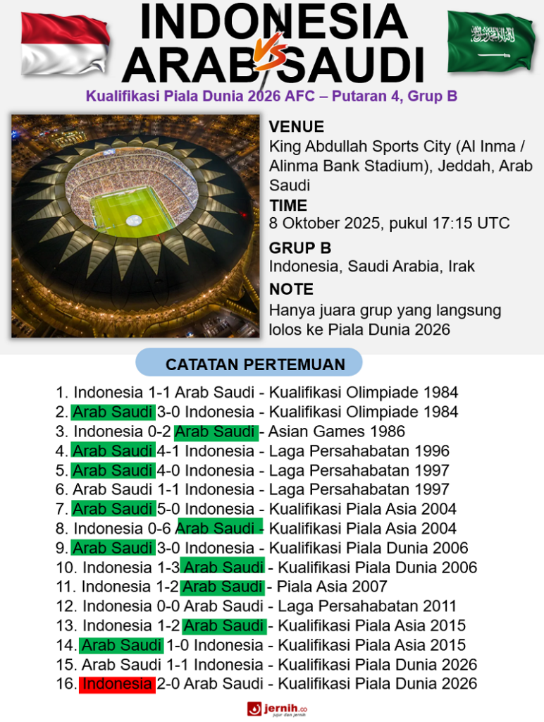 Catat: pertandingan Timnas Indonesia VS Arab Saudi akan berlangsung paa Rabu (9 Oktober 2025) dini hari, pukul: 00.15. Ini merupakan pertandingan pembuka Grup B yang akan menjadi modal menuju Piala Dunia 2026. Berikut info venue dan tim masing-masing negara.